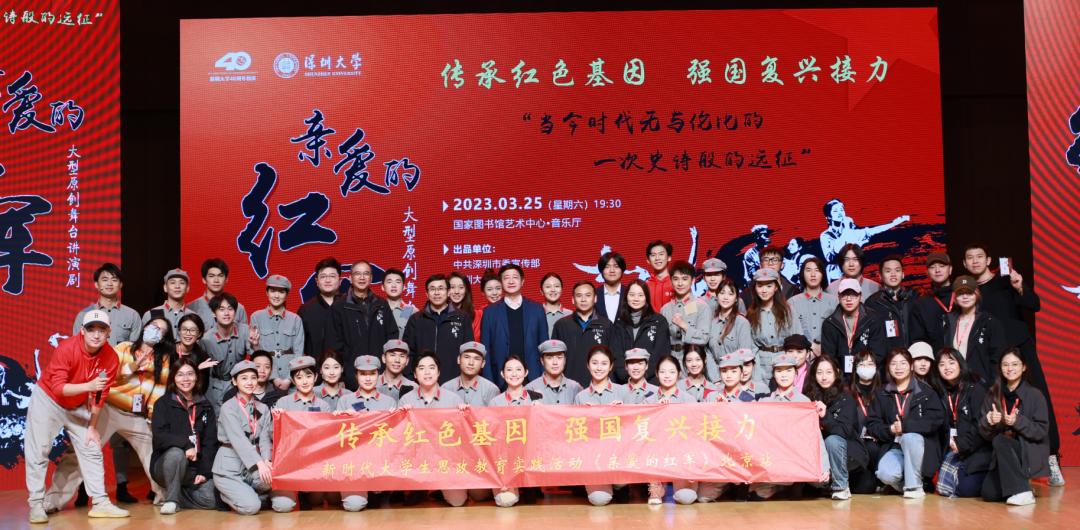 3月25日、26日,深圳大學大型原創舞臺講演劇《親愛的紅軍》在北京國圖藝術中心和中國傳媒大學上演。別具一格的表演形式、打動人心的表演內容,為北京的觀眾們帶來了兩場演出盛宴。作為新時代長征路上的主力軍,160余名深大學生,4年接力參演27場,共同演繹了一段雄偉壯麗的長征史詩。演出既是對長征精神的傳承與煥新,更是一次生動的黨史思政課。