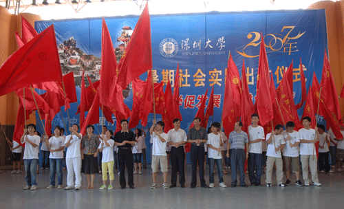 今年,我校大學生暑期社會實踐以“科學促發展,實踐創和諧”為主題,有12000余名學生參與學校集中組織和個人獨立參加的各類豐富的社會實踐活動。其中,學校集中組織4000名學生參加“和諧中國萬里行”、“和諧深圳社區行”、“和諧山村支教行”、“和諧城鄉調研行”、“和諧政企實習行”、“和諧家鄉服務行”、“和諧校園科創行”、“和諧香港回歸行”八大項目的實踐活動。昨日的啟動儀式后,200多支隊伍將奔赴包括深圳在內的全國各地城市鄉村廣泛開展課題調研、志愿服務、參觀考察、生產勞動、科技創新、勤工儉學等豐富多彩的社會實踐活動。