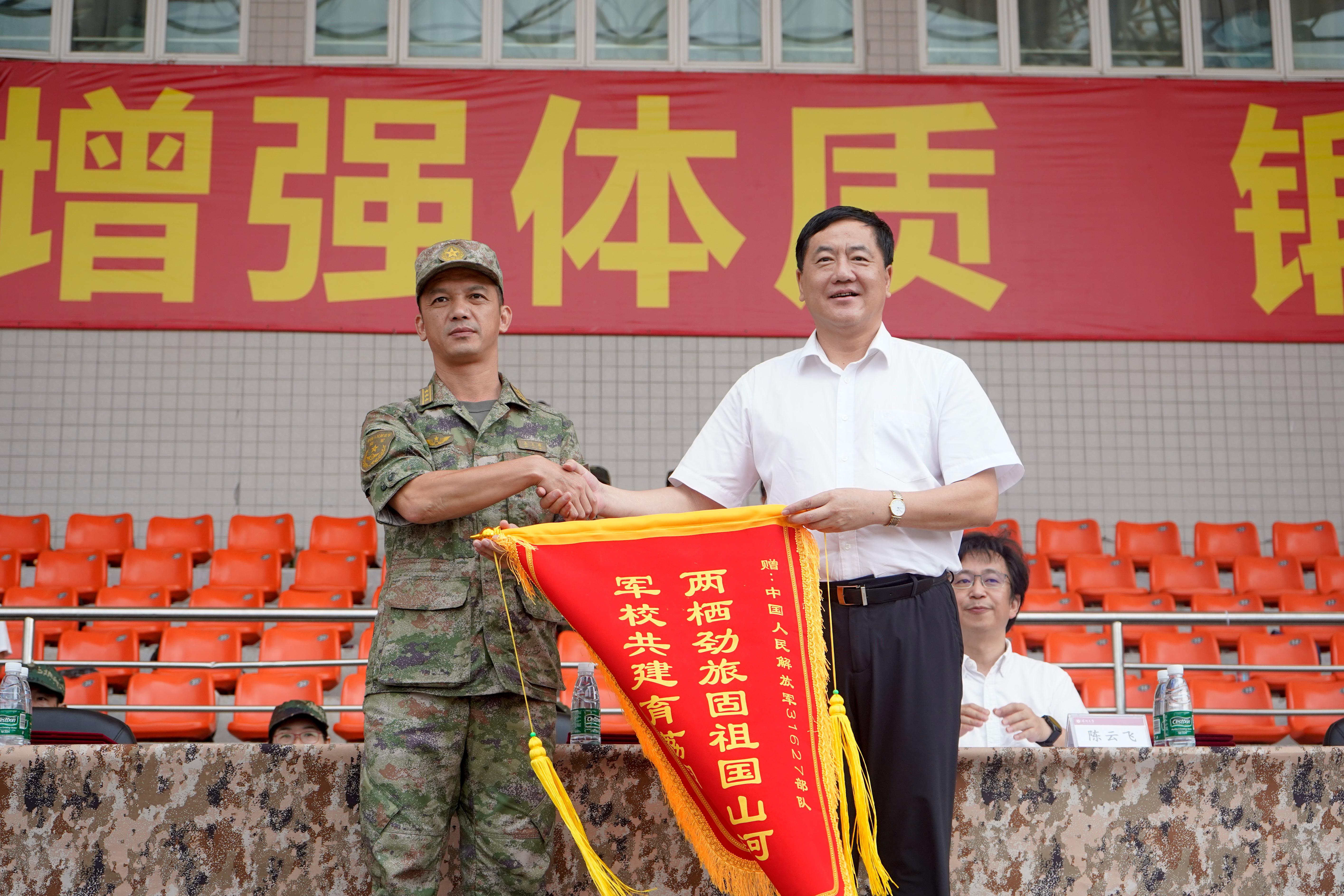 范志剛向承訓部隊贈送錦旗。武裝部宣讀表彰決定,范志剛、李永華為軍訓優秀教官、軍訓工作先進個人代表及軍訓優秀學員代表頒獎,并分別在兩校區大會上講話,向完成軍訓任務的新生表示祝賀,向承訓部隊和教官致敬致謝。