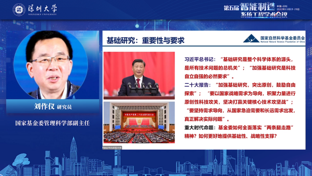 深圳大學(xué)校長、中國科學(xué)院院士毛軍發(fā),中國系統(tǒng)工程學(xué)會理事長、研究員楊曉光,中國系統(tǒng)工程學(xué)會智能制造系統(tǒng)工程委員會主任、合肥工業(yè)大學(xué)教授劉心報(bào),深圳大學(xué)管理學(xué)院副院長、教授周志民發(fā)表致辭;中國工程院院士楊善林、陳曉紅,國家基金委管理科學(xué)部副主任劉作儀研究員做線上特邀報(bào)告;中國工程院院士謝和平、郭仁忠、丁文華、陳湘生以及三十多位國家級人才計(jì)劃入選者通過線上線下結(jié)合的方式參加和支持本次大會。