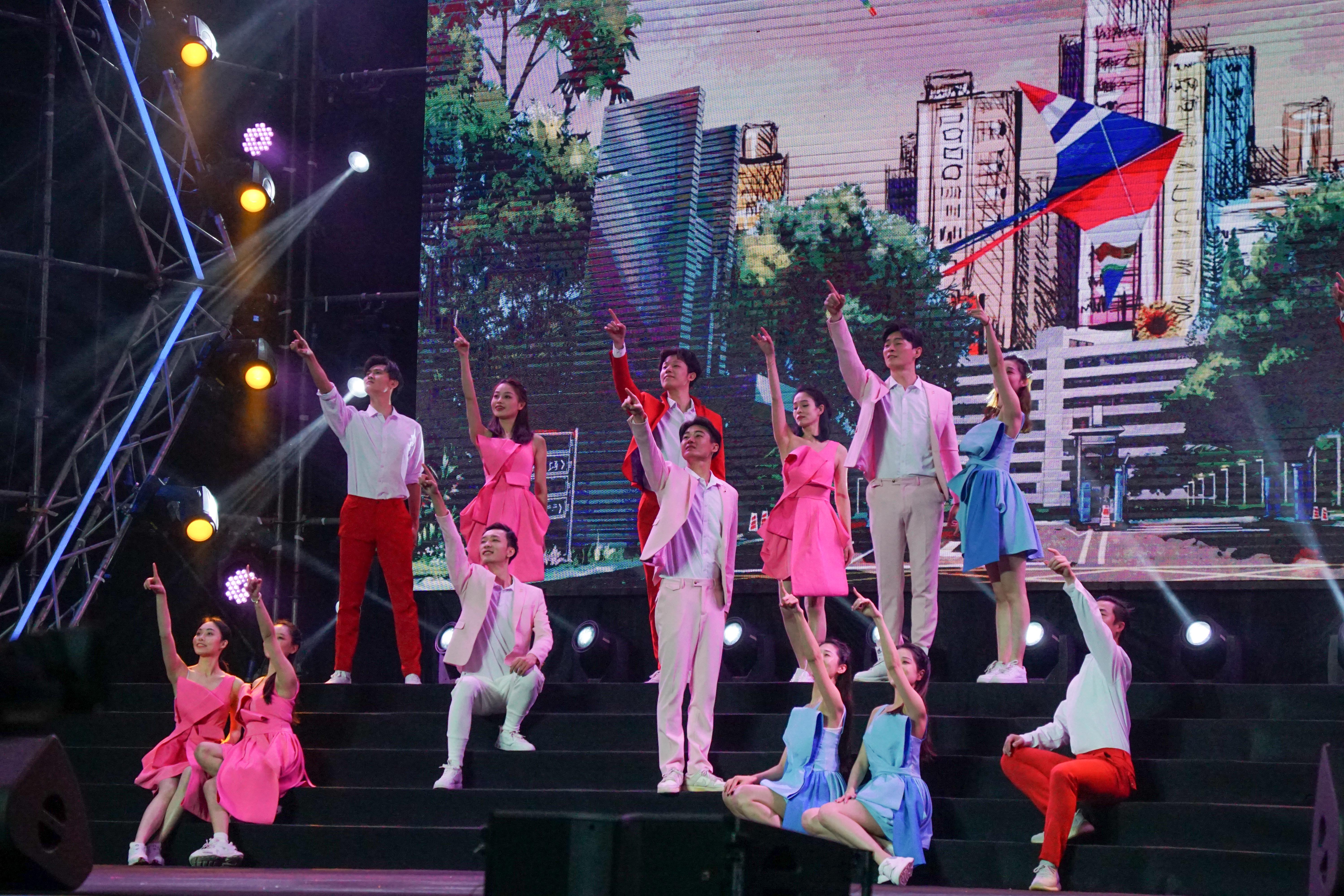 整場(chǎng)晚會(huì)共分為“荔園春早”“荔園芬芳”“荔園飛歌”三個(gè)篇章,采用歌曲聯(lián)唱、情景表演唱、情景講述、情景歌舞、配樂朗誦等多種藝術(shù)形式,以視覺化極強(qiáng)的情景故事方式串聯(lián),以道具加人物現(xiàn)場(chǎng)抒懷的節(jié)目形式連接不同時(shí)空,展現(xiàn)了深大一路走來的不凡歷程,40年來取得的累累成就,以及當(dāng)今深大學(xué)子的青春風(fēng)采。