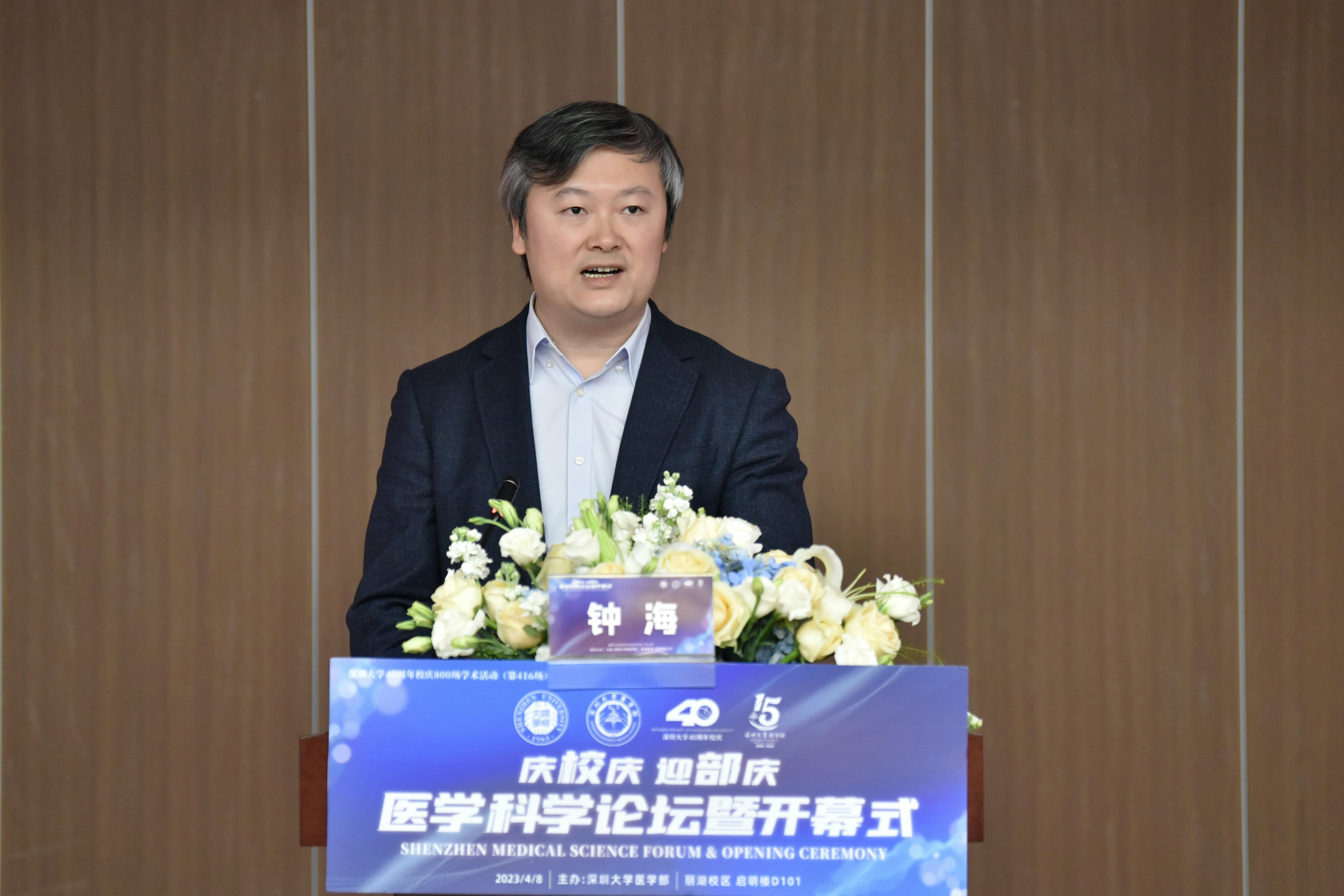 鐘海代表深圳市科創委對深圳大學、深大醫學部取得的優異辦學成績表示祝賀,并向社會各界支持深圳科技創新發展表示感謝。他表示,深圳是一個充滿魅力、活力、創造力的城市,科技創新領域成果豐碩。深圳全社會鼎力支持深圳大學建設,深圳大學快速發展,成果顯著。深圳一直高度重視醫學科學領域發展,積極推動產學研結合,期待與會各界人士共同推動深圳醫學科學發展邁向新臺階。