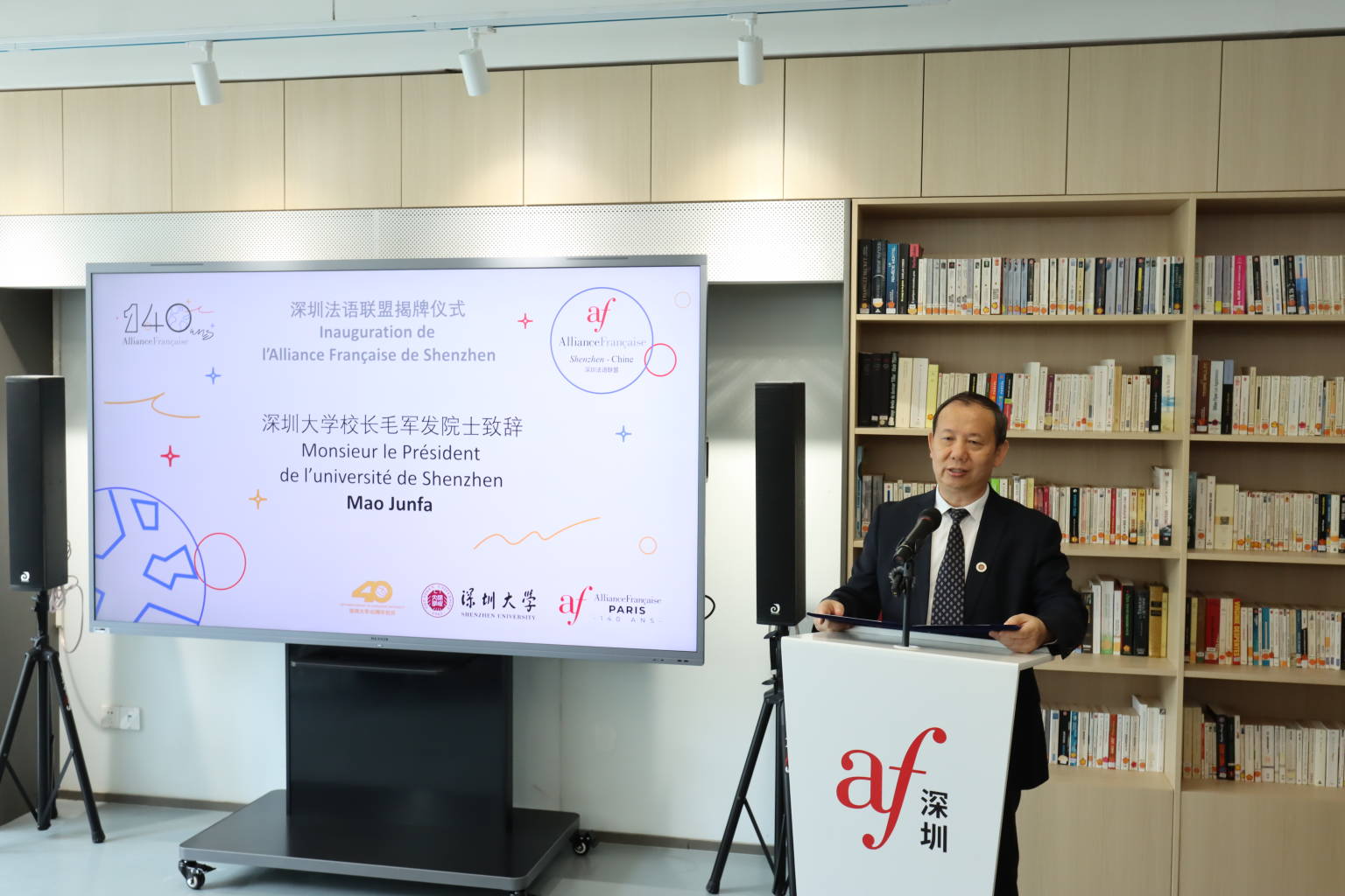 揭牌儀式上,毛軍發在致辭中表示,今年是深圳大學建校40周年,也是巴黎法語聯盟成立140周年,對合作雙方都是具有重要意義的一年。近年來深圳大學與法國高校在科學研究、合作辦學及文化交流等領域達成一系列合作,未來,深圳大學將擴大和世界一流高校的合作交流,為粵港澳大灣區和國家建設培養更多優秀人才。毛軍發表示,上周,法國總統馬克龍剛剛來華進行國事訪問,為兩國合作帶來新的機遇,深圳法語聯盟的成立正當其時。法語聯盟是中法友好的橋梁紐帶和中法教育合作交流的重要窗口,將為深圳民眾學習法語、培養大灣區法語人才創造有利條件,為增進中法兩國人民了解彼此文化提供優質平臺,也必定會為深圳大學法語學科建設及師資儲備提供重要支持。