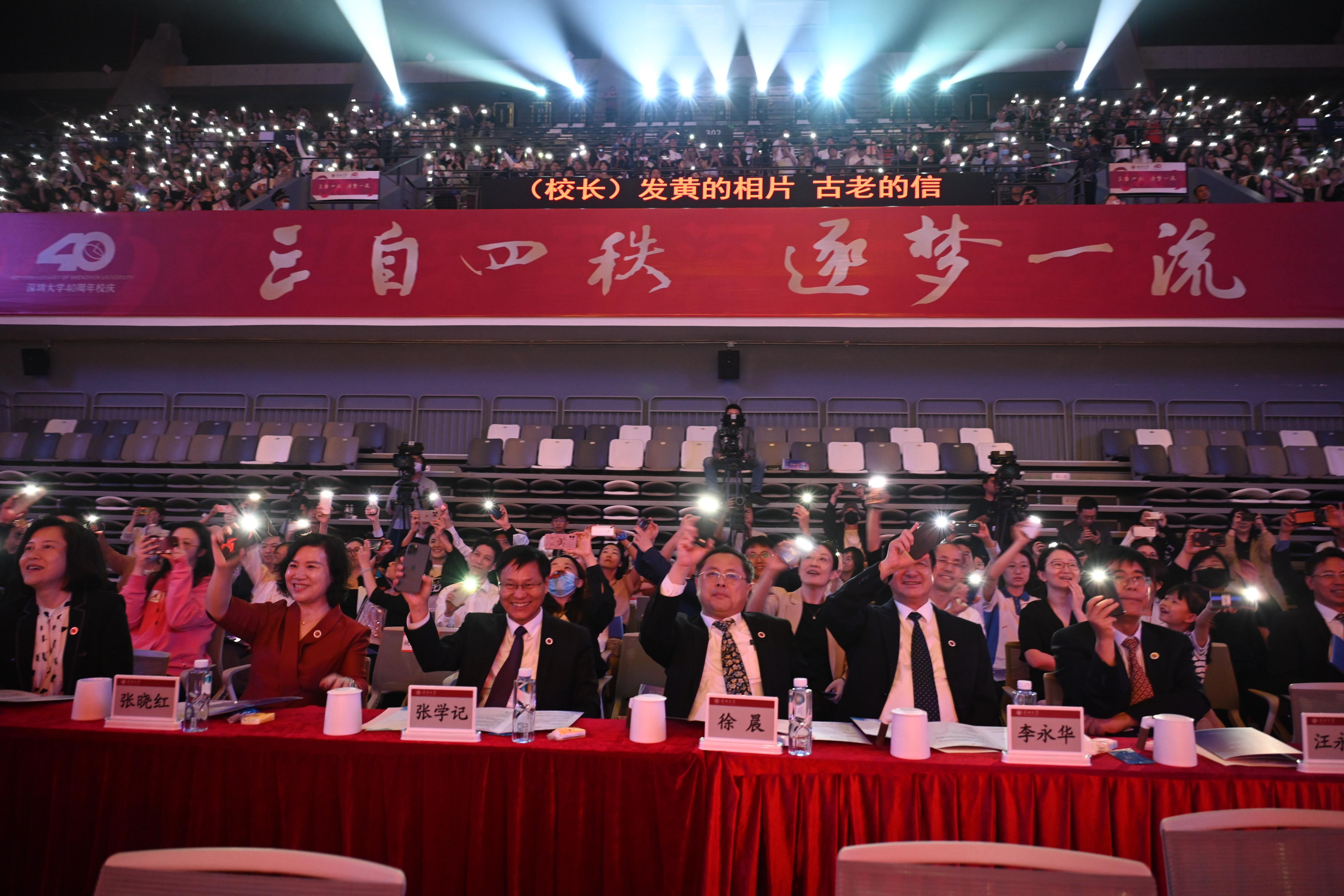 “流水它帶走光陰的故事,改變了我們,就在那多愁善感而初次回憶的青春……”晚會最大的亮點當屬合唱歌曲《光陰的故事》——深圳大學黨委書記李清泉、校長毛軍發與現場嘉賓、師生校友共同唱響深大四秩年華的朝暮與往昔,將晚會氣氛推向高潮。搖動的手機燈光如同夜空繁星,動人的場景濃縮著愛意,現場師生和校友情不自禁加入合唱,青春的旋律響徹荔園。