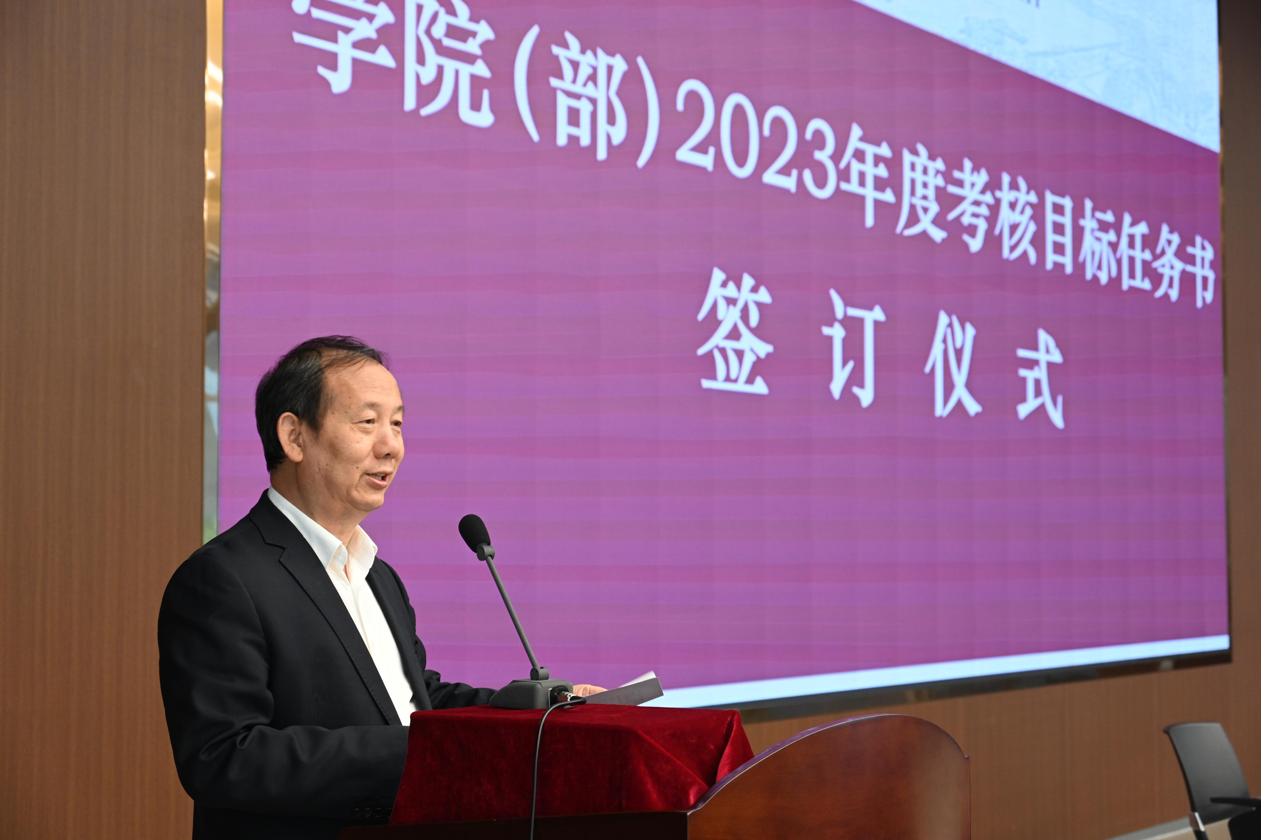 為推進(jìn)學(xué)校“十四五”規(guī)劃目標(biāo)任務(wù)落實、落地,深入推動學(xué)院(部)“十四五”發(fā)展建設(shè),4月27日下午,深圳大學(xué)學(xué)院(部)2023年度考核目標(biāo)任務(wù)書簽訂儀式在麗湖校區(qū)啟明樓C101多功能廳舉行。校黨委書記李清泉、校長毛軍發(fā),副校長徐晨、李永華、張曉紅出席,副校長張學(xué)記主持儀式,有關(guān)職能部門、各學(xué)院(部)黨政主要負(fù)責(zé)人參加會議。