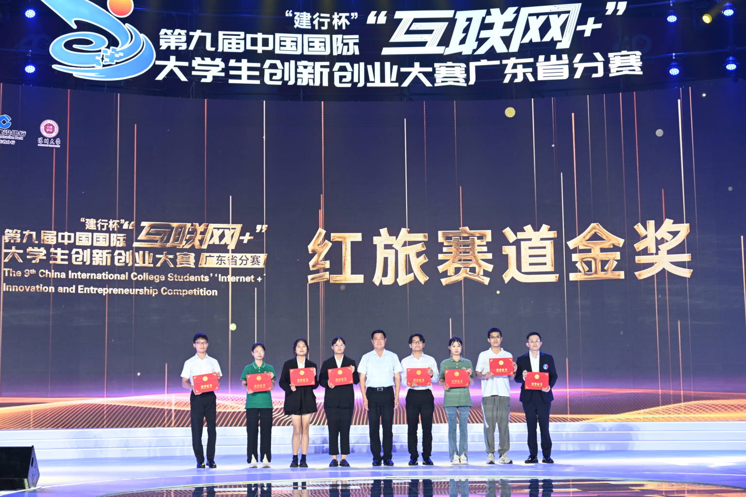 頒獎儀式上,與會領導和嘉賓為冠亞季軍團隊以及獲得學校集體獎的院校代表、獲得金獎的項目團隊代表頒獎。在隨后的會旗交接儀式上,本屆“互聯網+”廣東省分賽承辦高校深圳大學鄭重將會旗交與第十屆“互聯網+”廣東省分賽承辦院校嶺南師范學院。閉幕式開場燈光秀和舞蹈節目《闖》、歌舞節目《破浪》也都體現了創新創業的精神內核。