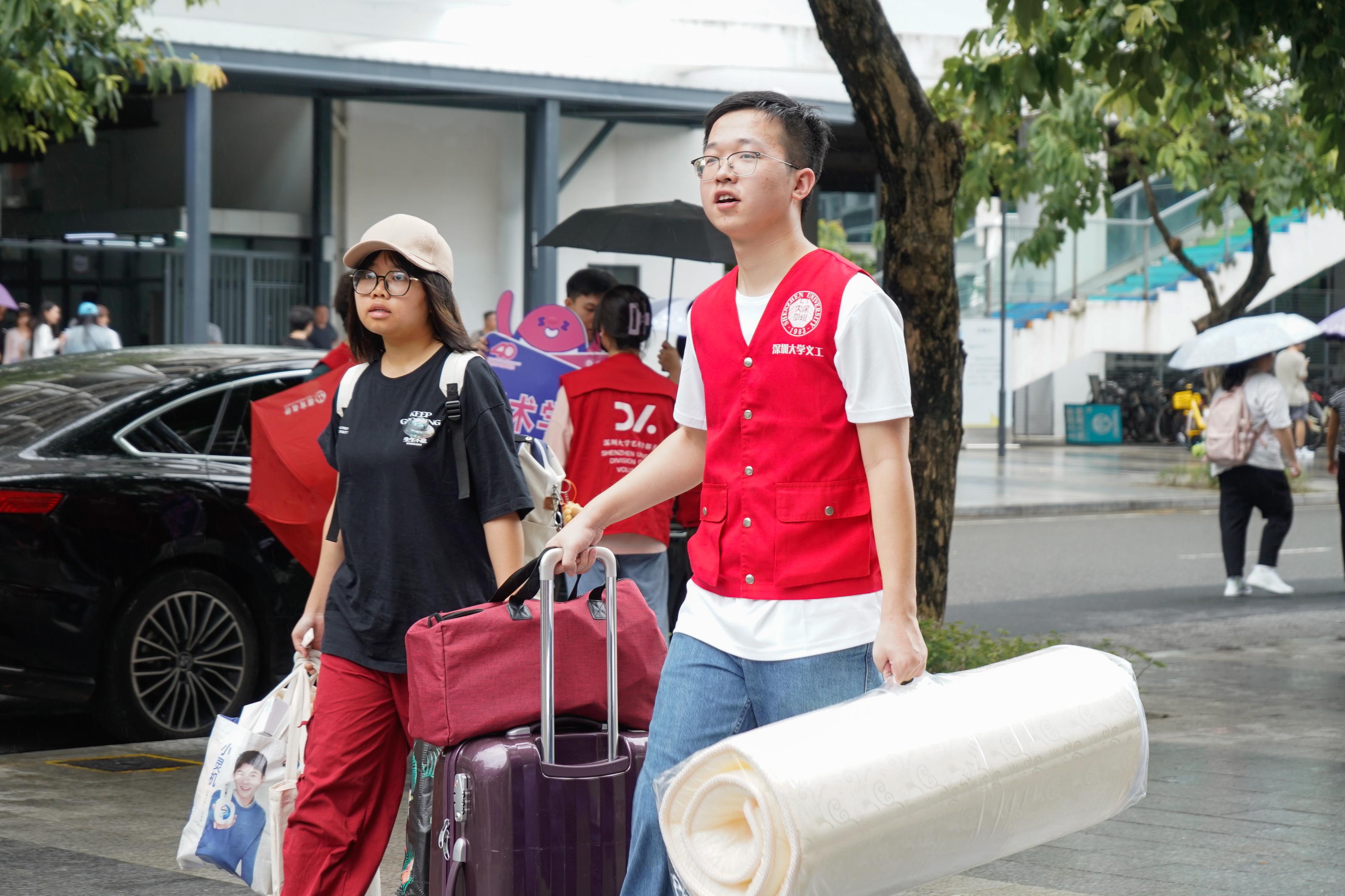 在麗湖校區,副校長李永華一行前往宿舍樓的新生報到區慰問,了解學生居住情況,聽取大家對宿舍環境的需求和建議。正義廣場上,“愛上深大”的巨大海報和“這一站,深圳大學”的雕塑引來許多新生拍照打卡。