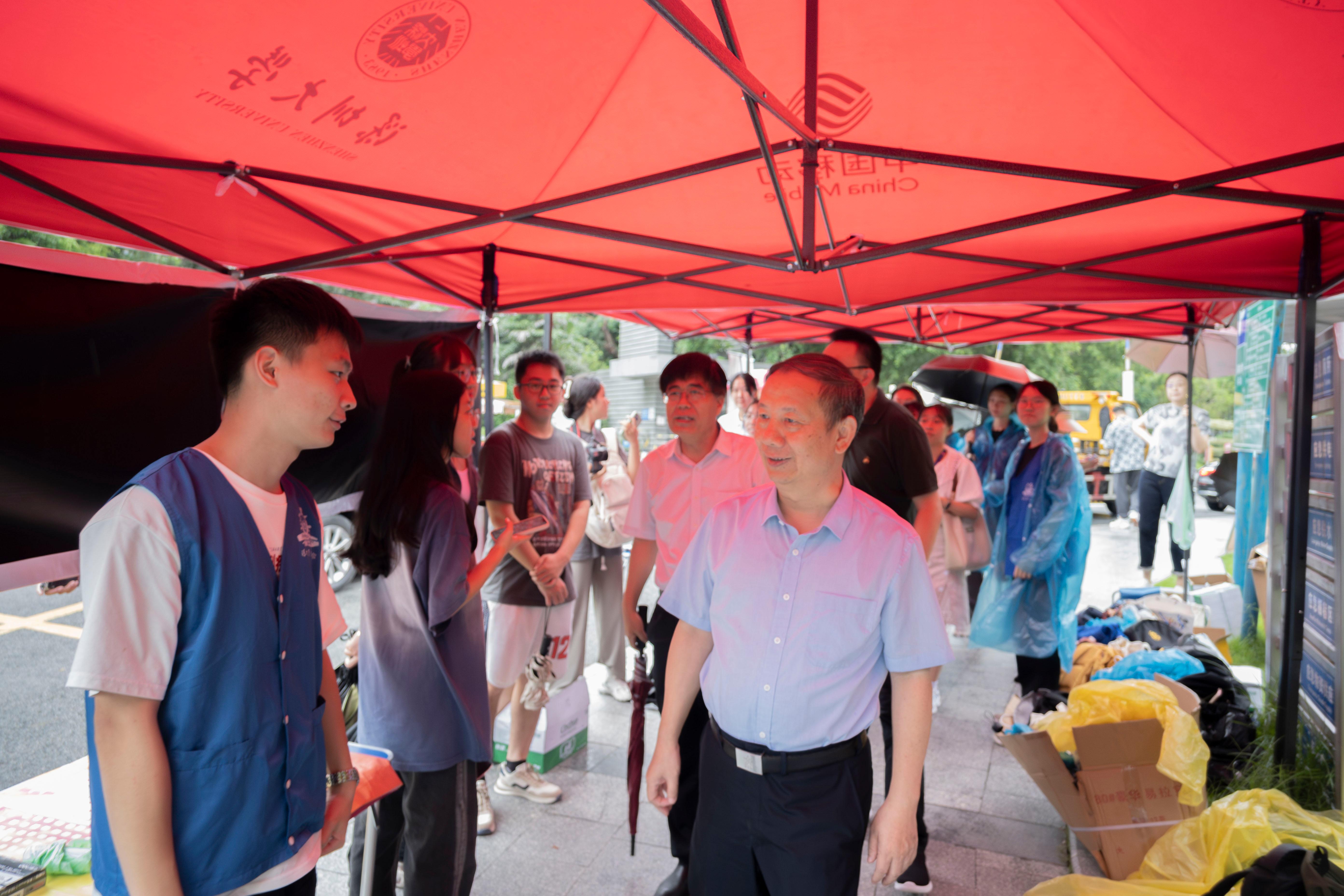 9月9日,新生陸續如約而來。一大早,清風裹挾著綿綿細雨,校長毛軍發、副校長汪永成就先后到粵海校區立德門、紫薇齋報到區、紅豆齋宿舍和立言門走訪,關切地詢問新生情況,與新生家長溝通交流。“你們放心,我們會照顧好孩子們的。”毛軍發對前來送行的家長們說。一位來自廣東梅州的新生家長表示,剛到學校就看到校長親自來迎接新生,學校的安排也很妥當,“心里踏實了好多”。