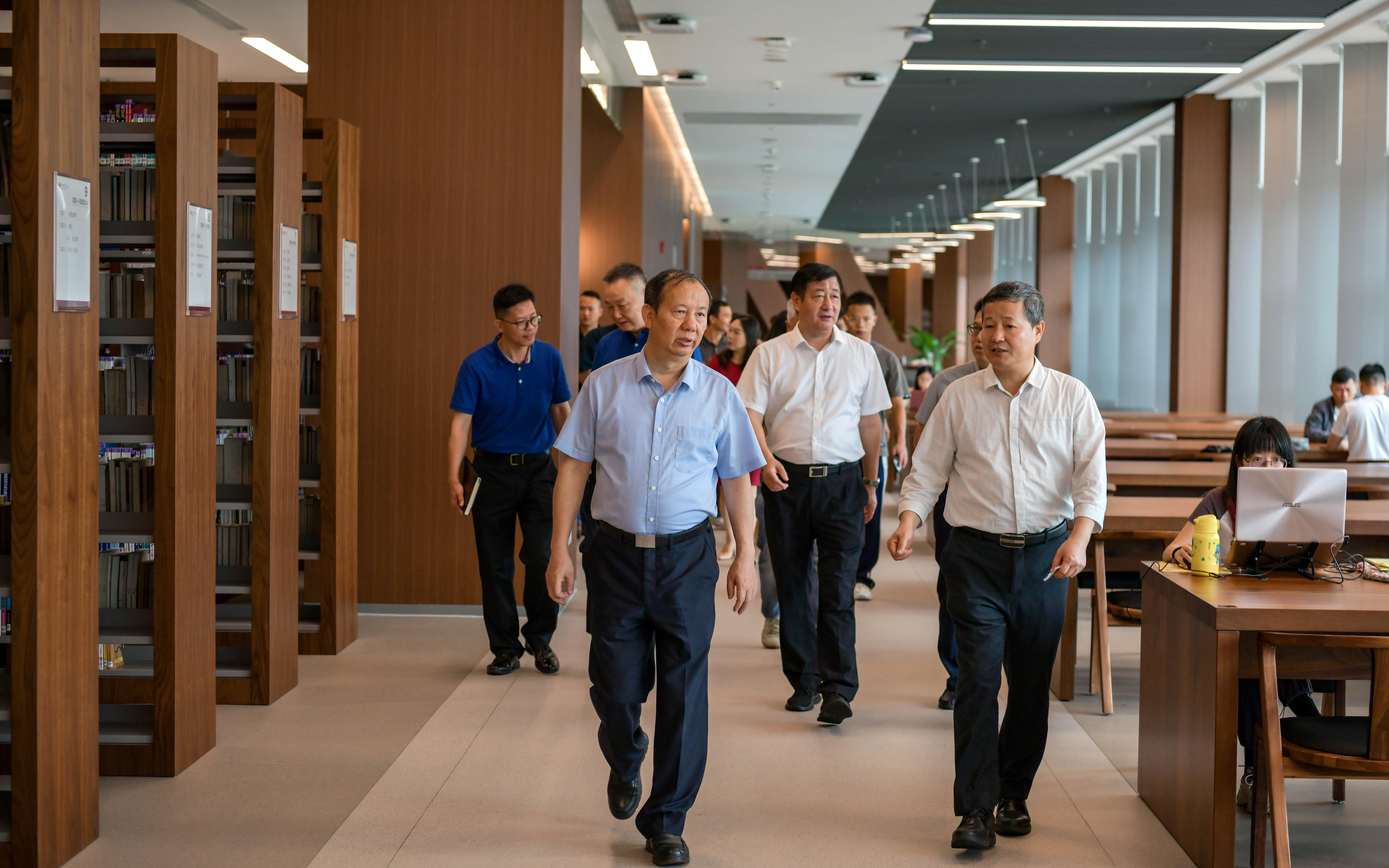 在麗湖校區(qū)中央圖書館,毛軍發(fā)一行先后參觀了閱讀空間、藏書室、學(xué)習(xí)空間、立體書庫和研討空間。通過麗湖校區(qū)管理辦公室負(fù)責(zé)人和中央圖書館負(fù)責(zé)人、工作人員的介紹,校領(lǐng)導(dǎo)和嘉賓進(jìn)一步了解中央圖書館的情況,對場地使用率、展廳布置和設(shè)計(jì)展開探討。調(diào)研途中,毛軍發(fā)一行來到自習(xí)區(qū),同學(xué)生們坐在一起,親切地詢問本科新生在圖書館學(xué)習(xí)的感受,勉勵他們刻苦鉆研、學(xué)有所成。同學(xué)們欣喜感動,祝福校領(lǐng)導(dǎo)和老師們教師節(jié)快樂,紛紛主動與校長一行合影留念。