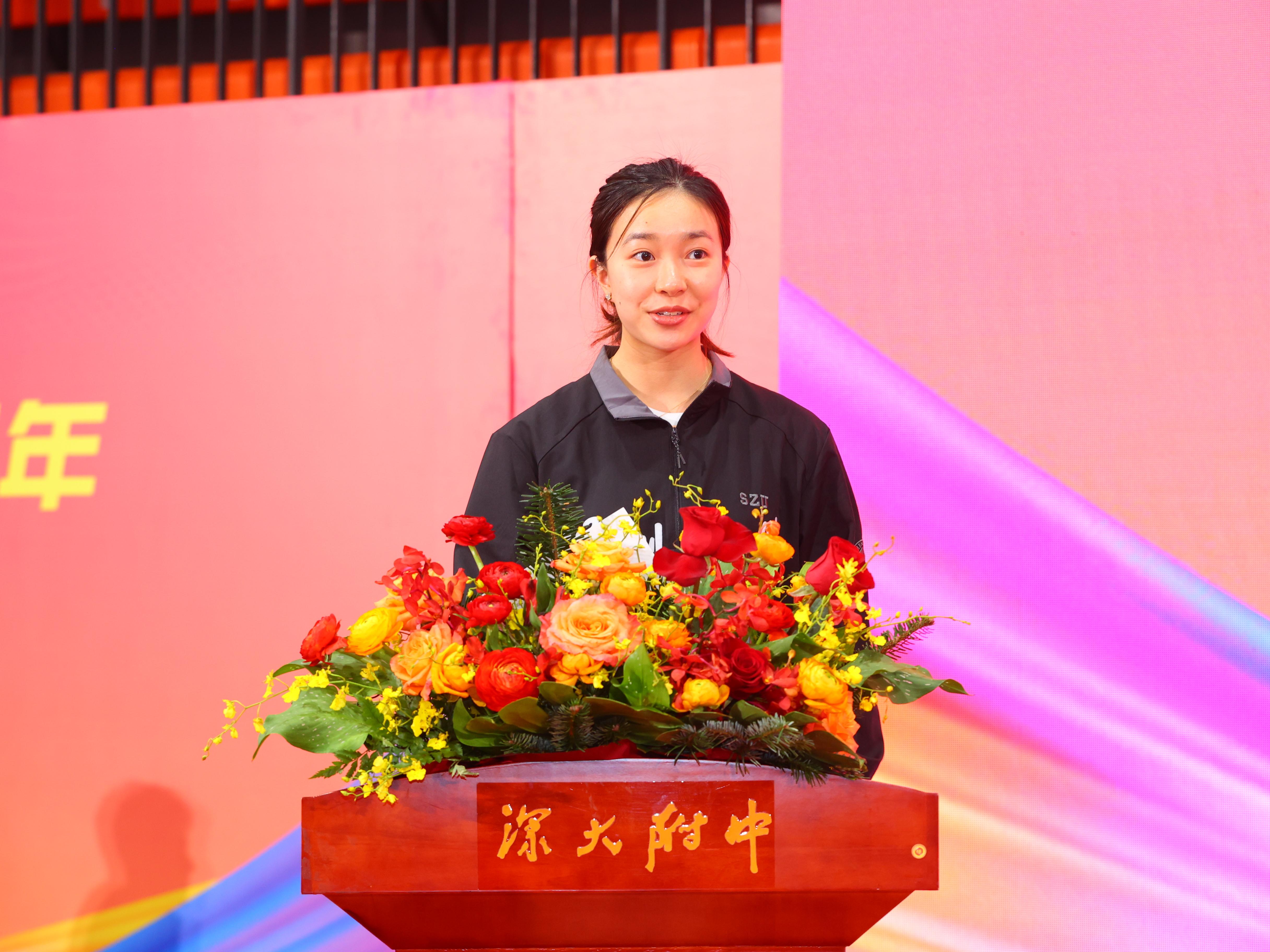 深大附中副校長邊海峰在致辭中表示,深大附中堅持體教融合,扎實推進“每天一節體育課”,貫徹落實立德樹人的根本任務,將大思政課延伸到校園的每個角落,讓學生在廣闊的天地中接受思想的洗禮和熏陶,實現身心的滋養和進步,努力成為有理想、有擔當、有拼搏精神的“拿云少年”。他希望深大附中的“拿云少年”以奧運冠軍為榜樣,在今后的學習生活中,直面困難和挑戰,用辛勤的汗水、堅韌的品格,為實現個人理想而持續奮斗,為祖國繁榮富強貢獻自己的青春力量。