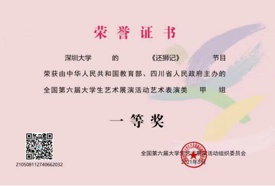 由中華人民共和國教育部、四川省政府共同主辦的全國第六屆大學生藝術展演活動于2021年5月6日-13日在成都市舉辦。深圳大學戲劇作品《還獅記》獲得藝術表演類甲組一等獎、優(yōu)秀創(chuàng)作獎,展示了深圳大學藝術教育的高水平、高質(zhì)量。